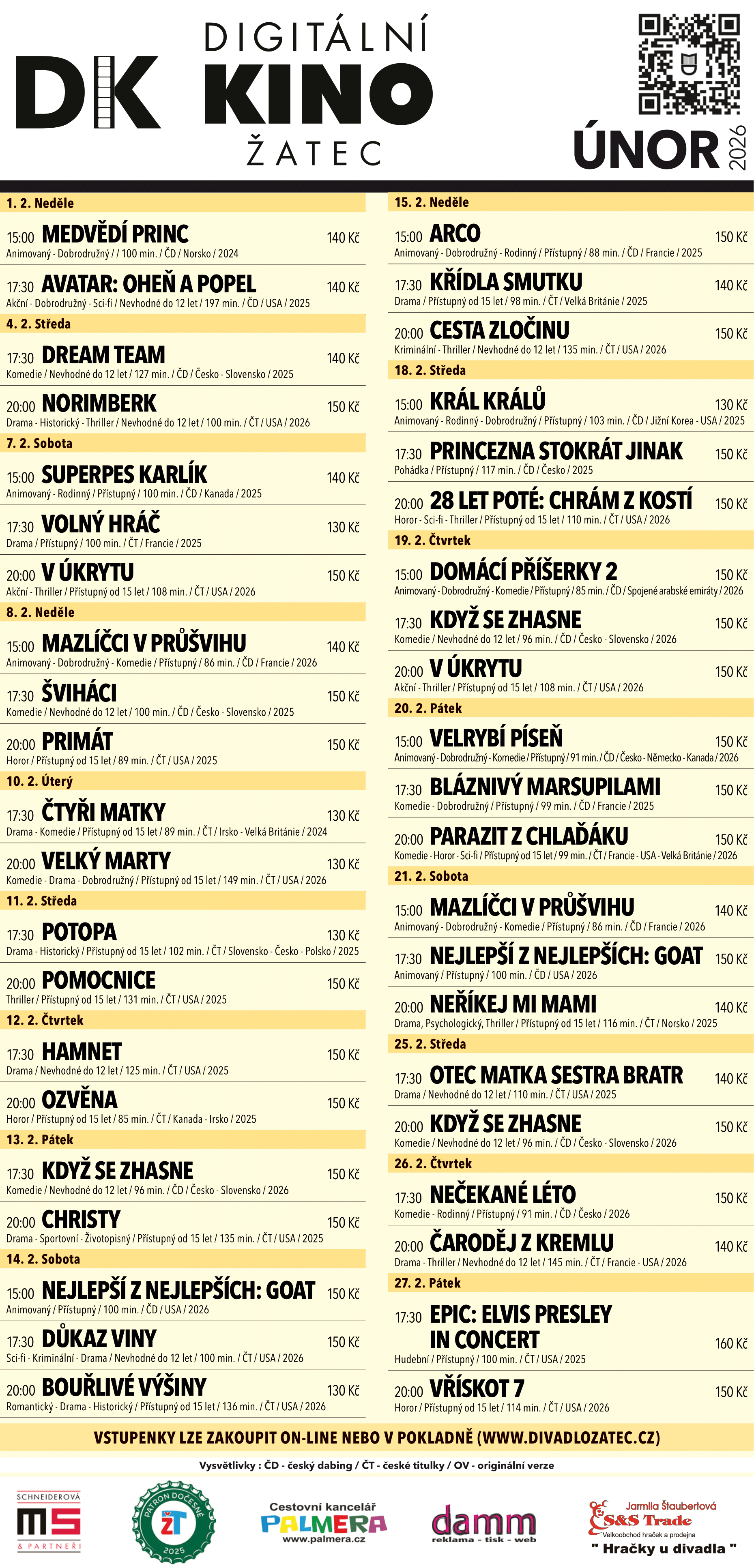 Program Městského divadla únor 2026 ke stažení ZDE, program Digitálního kina ke stažení ZDE.