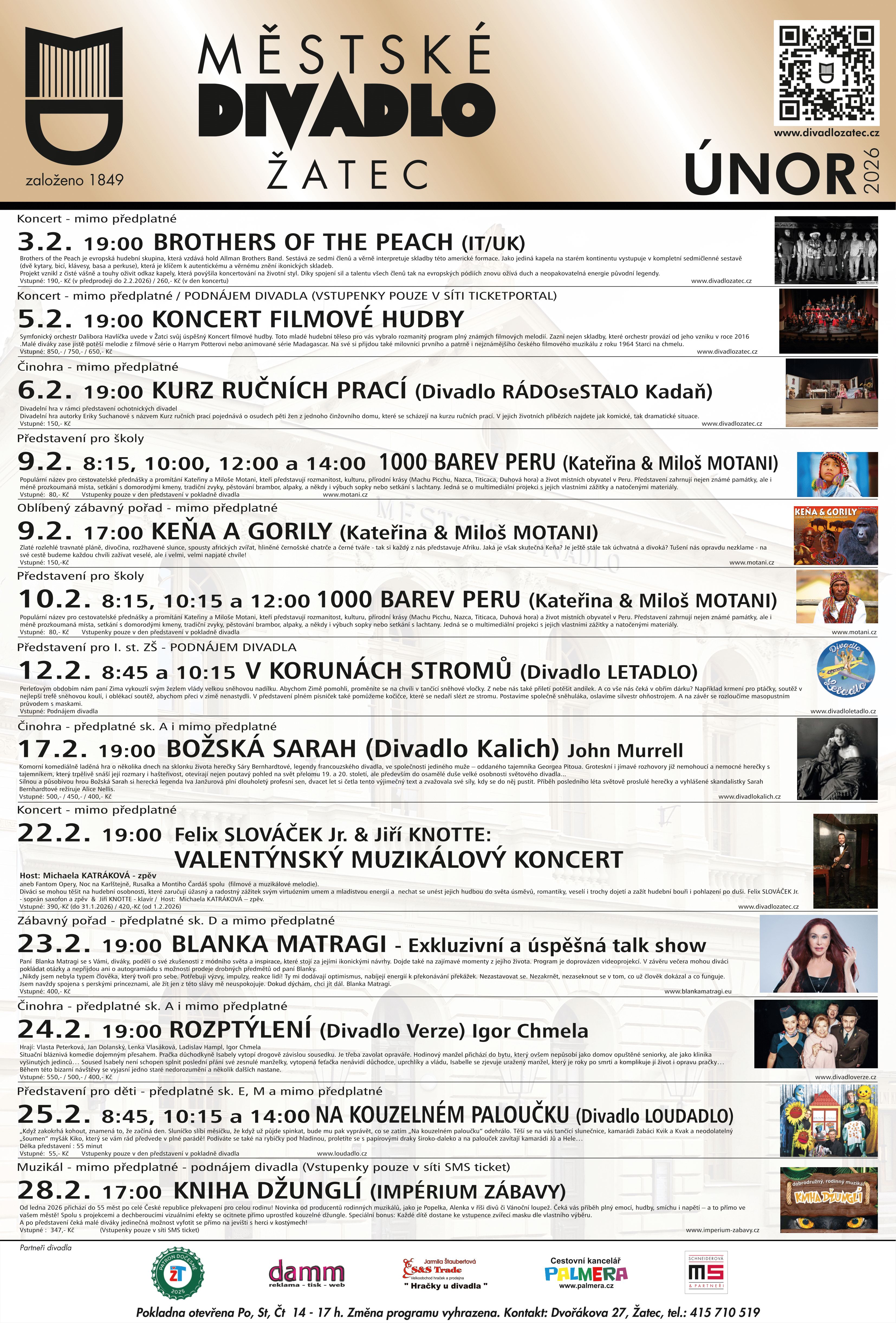 Program Městského divadla únor 2026 ke stažení ZDE, program Digitálního kina ke stažení ZDE.